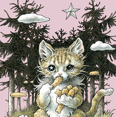 『おかきの山』 くんくん… ああ、どこからか香ばしいかおりが… こねこの目のまえを空とぶ ふしぎな魚がとおりすぎていきます まてまてー ふしぎな魚をおって 背のたかい 針葉樹の森をぬけ たどりついたところは たくさんのおかきの魚が ぷかぷかと 楽しそうに泳ぐ おかきの山でした (…カリポリ!)